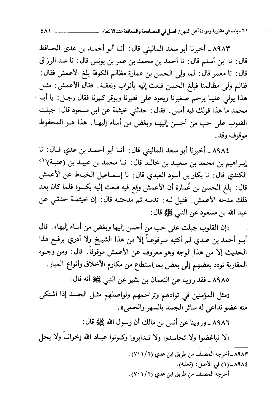 إن القلوب جبلت على حب من أحسن إليها و بغض من أساء إليها قال أبو أحمد بن عدي لم أكتبه مرفوعا إلا من هذا الشيخ و لا أدري برفع هذا الحديث إلا من هذا الوجه و هو معروف عن الأعمش موقوفا قال : و من وجوه المقاربة تودد بعضهم إلى بعض بما استطاع من مكارم الأخلاق و أنواع المبار