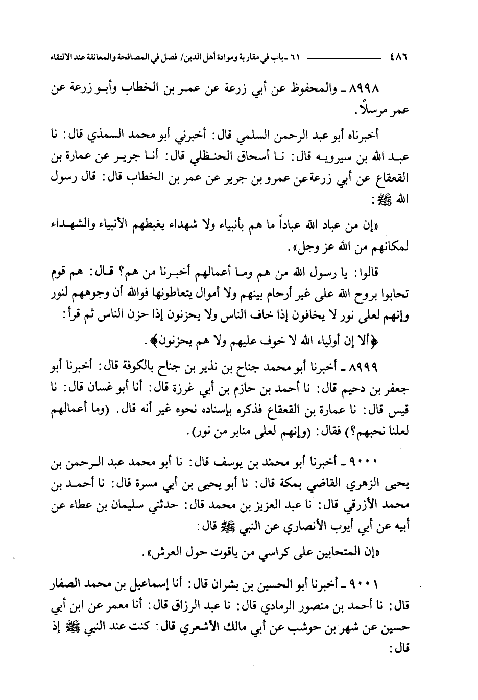 قالوا : يا رسول الله من هم و ما أعمالهم أخبرنا من هم ؟ قال : هم قوم تحابوا بروح الله على غير أرحام بينهم و لا أموال يتعاطونها فو الله أن وجوههم لنور و إنهم لعلى نور لا يخافون إذا خاف الناس و لا يحزنون إذا حزن الناس ثم قرأ :