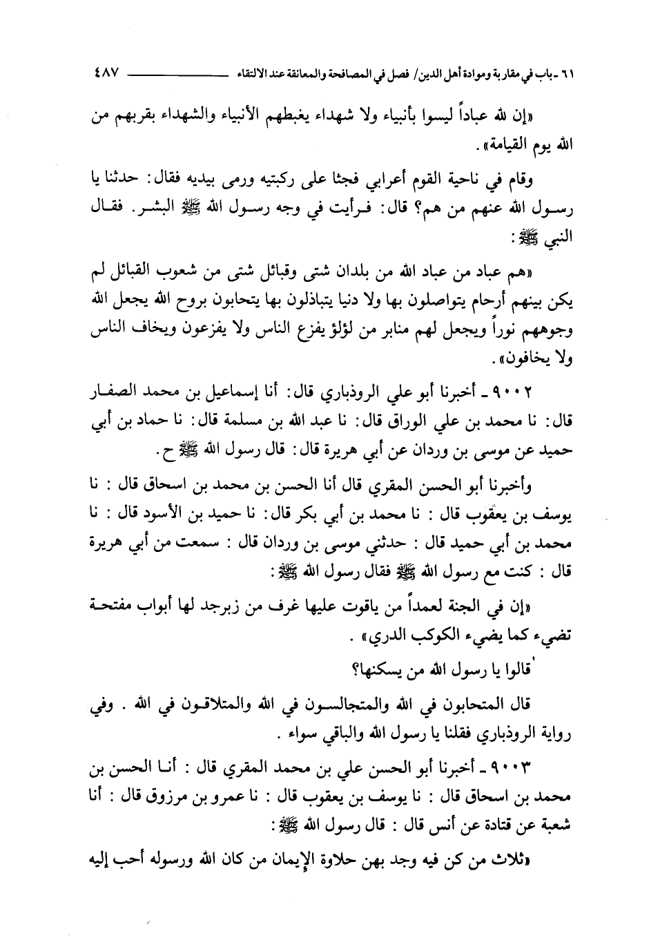9002 - أخبرنا أبو علي الروذباري قال : أنا إسماعيل بن محمد الصفار قال : نا محمد بن علي الوراق قال : نا عبد الله بن مسلمة قال : نا حماد بن أبي حميد عن موسى بن وردان عن أبي هريرة قال : قال رسول الله صلى الله عليه و سلم ح