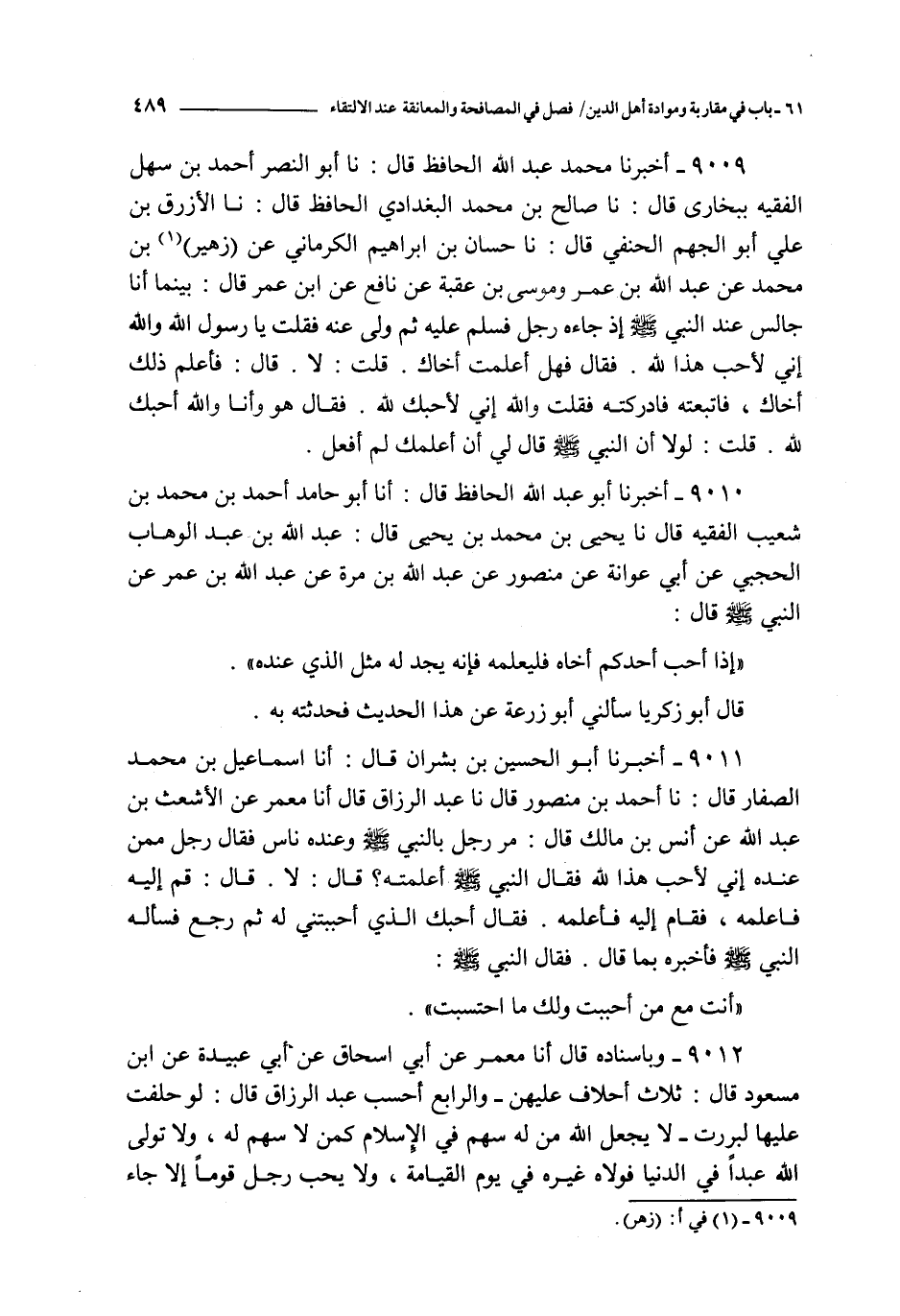 9009 - أخبرنا محمد عبد الله الحافظ قال : نا أبو النصر أحمد بن سهل الفقيه ببخارى قال : نا صالح بن محمد البغدادي الحافظ قال : نا الأزرق بن علي أبو الجهم الحنفي قال : نا حسان بن إبراهيم الكرماني عن زهير بن محمد عن عبد الله بن عمر و موسى بن عقبة عن نافع عن ابن عمر قال : بينما أنا جالس عند النبي صلى الله عليه و سلم إذ جاءه رجل فسلم عليه ثم ولى عنه فقلت يا رسول الله و الله إني لأحب هذا لله فقال فهل أعلمت أخاك قلت : لا قال : فأعلم ذلك أخاك فاتبعته فادركته فقلت و الله إني لأحبك لله فقال هو و أنا و الله أحبك لله قلت : لولا أن النبي صلى الله عليه و سلم قال لي أن أعلمك لم أفعل