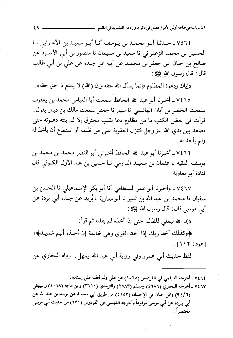 7467 - و أخبرنا أبو عمر البسطامي أنا أبو بكر الإسماعيلي نا الحسن بن سفيان نا محمد بن عبد الله بن نمير نا أبو معاوية نا بريد عن جده أبي بردة عن أبي موسى قال : قال رسول الله صلى الله عليه و سلم :