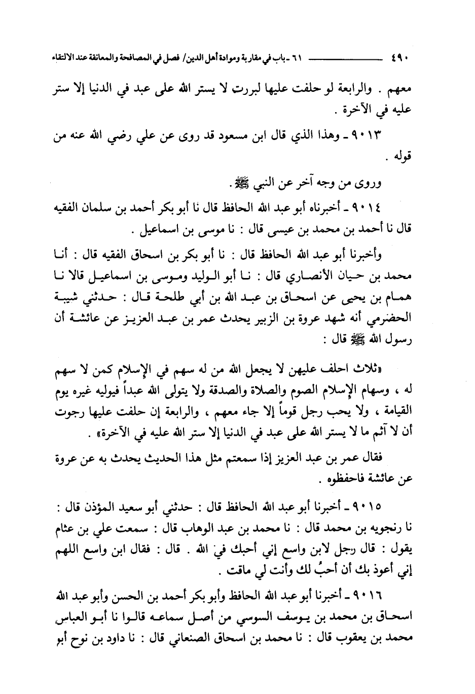 9016 - أخبرنا أبو عبد الله الحافظ و أبو بكر أحمد بن الحسن و أبو عبد الله إسحاق بن محمد بن يوسف السوسي من أصل سماعه قالوا نا أبو العباس محمد بن يعقوب قال : نا محمد بن إسحاق الصنعاني قال : نا داود بن نوح أبو سليمان الأشقر قال : نا إسماعيل بن عياش عن يحيى بن الحارث الدماري عن القاسم عن أبي أمامة : عن النبي صلى الله عليه و سلم قال :