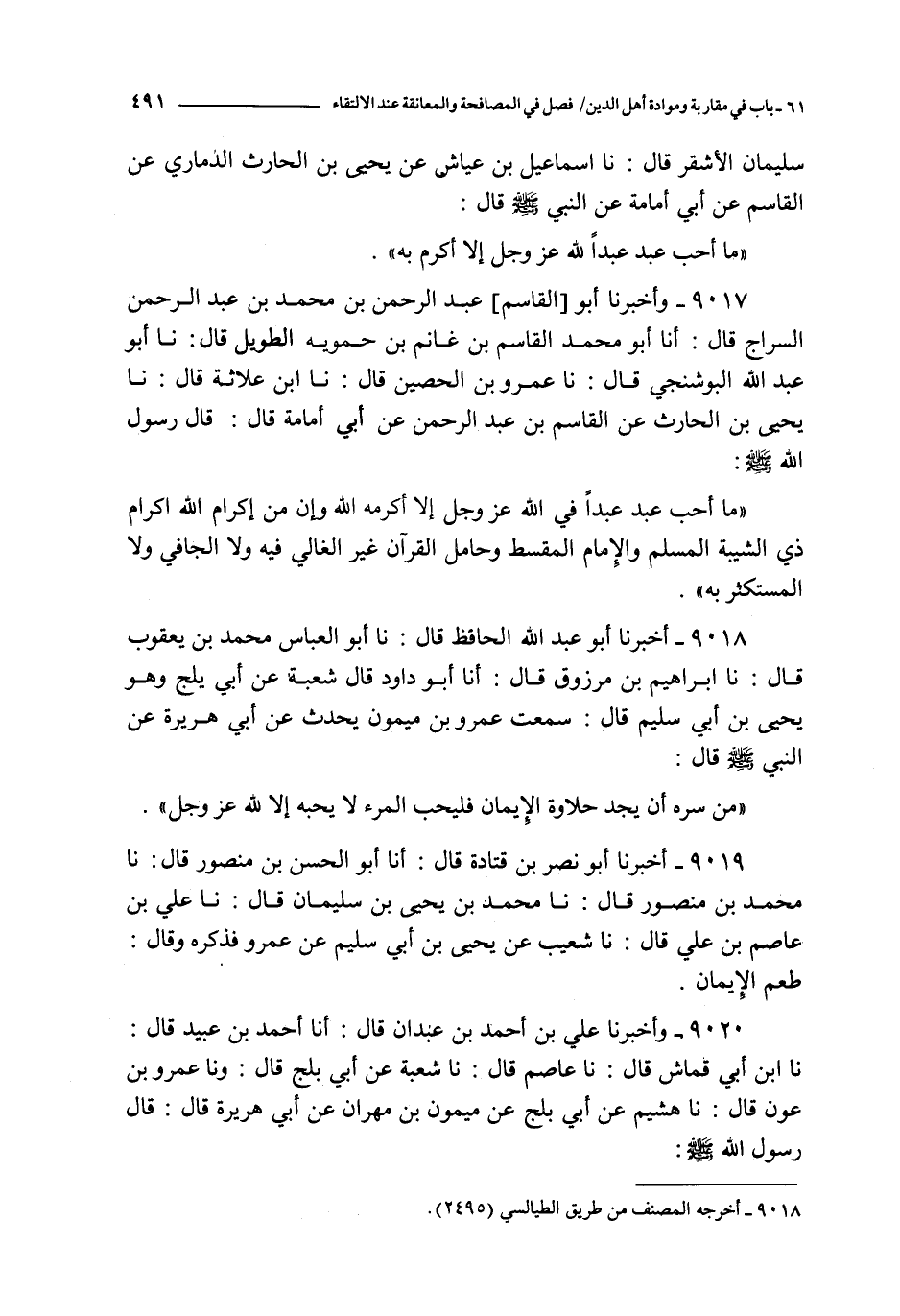 9019 - أخبرنا أبو نصر بن قتادة قال : أنا أبو الحسن بن منصور قال : نا محمد بن منصور قال : نا محمد بن يحيى بن سليمان قال : نا علي بن عاصم بن علي قال : نا شعيب عن يحيى بن أبي سليم عن عمرو : فذكره و قال : طعم الإيمان