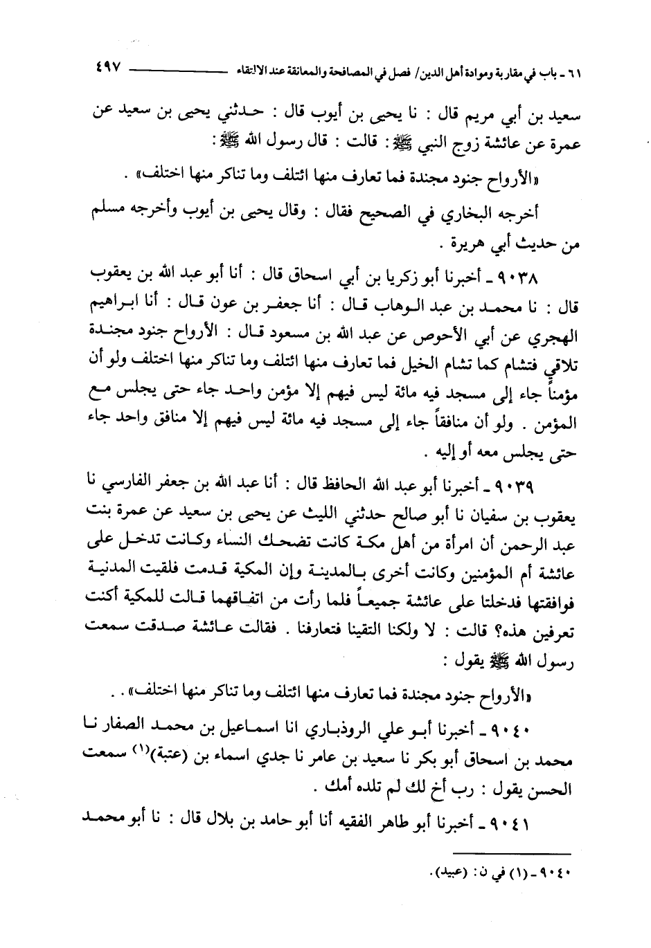 9038 - أخبرنا أبو زكريا بن أبي إسحاق قال : أنا أبو عبد الله بن يعقوب قال : نا محمد بن عبد الوهاب قال : أنا جعفر بن عون قال : أنا إبراهيم الهجري عن أبي الأحوص عن عبد الله بن مسعود قال : الأرواح جنود مجندة تلاقي فتشام كما تشام الخيل فما تعارف منها ائتلف و ما تناكر منها اختلف و لو أن مؤمنا جاء إلى مسجد فيه مائة ليس فيهم إلا مؤمن واحد جاء حتى يجلس مع المؤمن و لو أن منافقا جاء إلى مسجد فيه مائة ليس فيهم إلا منافق واحد جاء حتى يجلس معه أو إليه