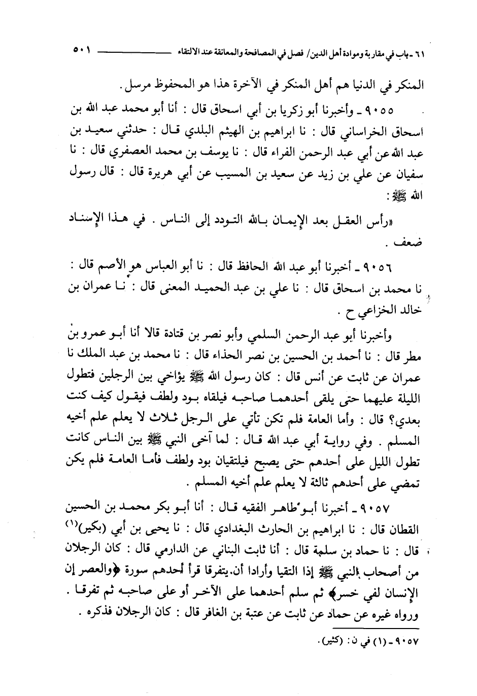 9056 - أخبننا أبو عبد الله الحافظ قال : نا أبو العباس هو الأصم قال : نا محمد بن إسحاق قال : نا علي بن عبد الحميد المعنى قال : نا عمران بن خالد الخزاعي ح