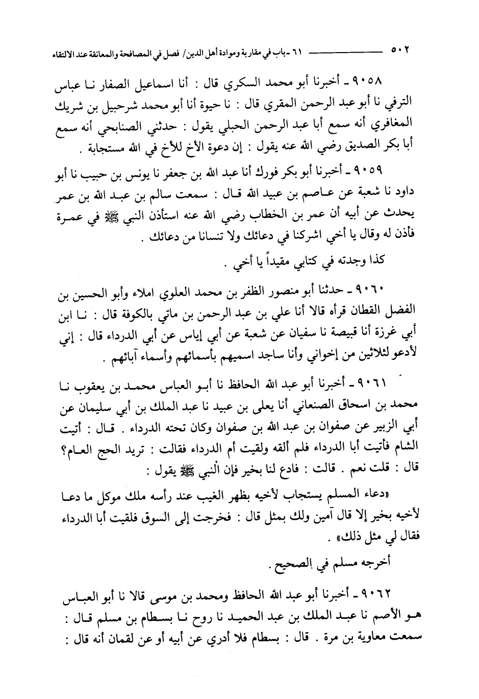9058 - أخبرنا أبو محمد السكري قال : أنا إسماعيل الصفار نا عباس الترفي نا أبو عبد الرحمن المقري قال : نا حيوة أنا أبو محمد شرحبيل بن شريك المغافري أنه سمع أبا عبد الرحمن الحلبي يقول : حدثني الصنابحي أنه سمع أبا بكر الصديق رضي الله عنه يقول : إن دعوة الأخ للأخ في الله مستجابة