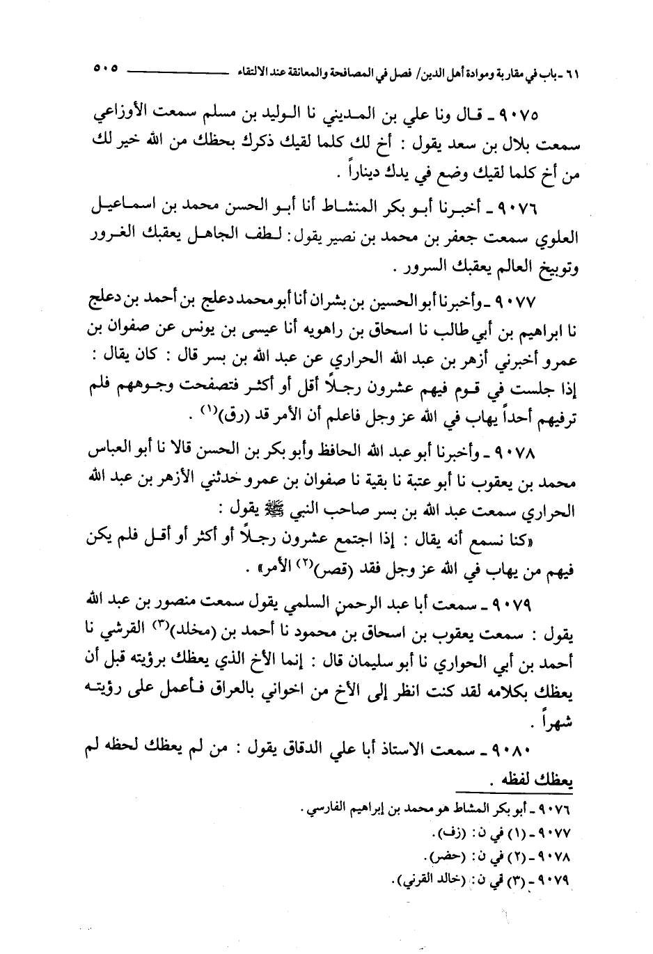 9079 - سمعت أبا عبد الرحمن السلمي يقول سمعت منصور بن عبد الله يقول : سمعت يعقوب بن إسحاق بن محمود نا أحمد بن مخلد القرشي نا أحمد بن أبي الحواري نا أبو سليمان قال : إنما الأخ الذي يعظك برؤيته قبل أن يعظك بكلامه لقد كنت انظر إلى الأخ من إخواني بالعراق فأعمل على رؤيته شهرا