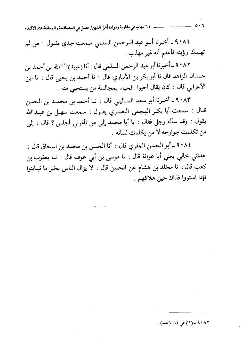 9082 - أخبرنا أبو عبد الرحمن السلمي قال : أنا عبيد الله بن أحمد بن حمدان الزاهد قال نا أبو بكر بن الأنباري قال : نا أحمد بن يحيى قال : نا ابن الأعرابي قال : كان يقال أحيوا الحياء بمجالسة من يستحيي منه