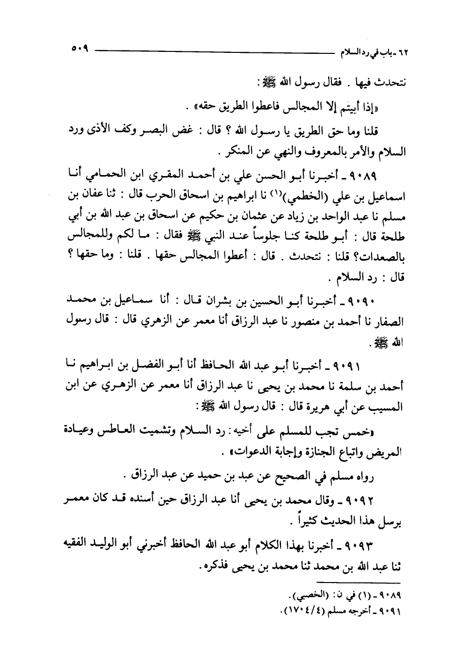 9090 - أخبرنا أبو الحسين بن بشران قال : أنا إسماعيل بن محمد الصفار نا أحمد بن منصور نا عبد الرزاق أنا معمر عن الزهري قال : قال رسول الله صلى الله عليه و سلم