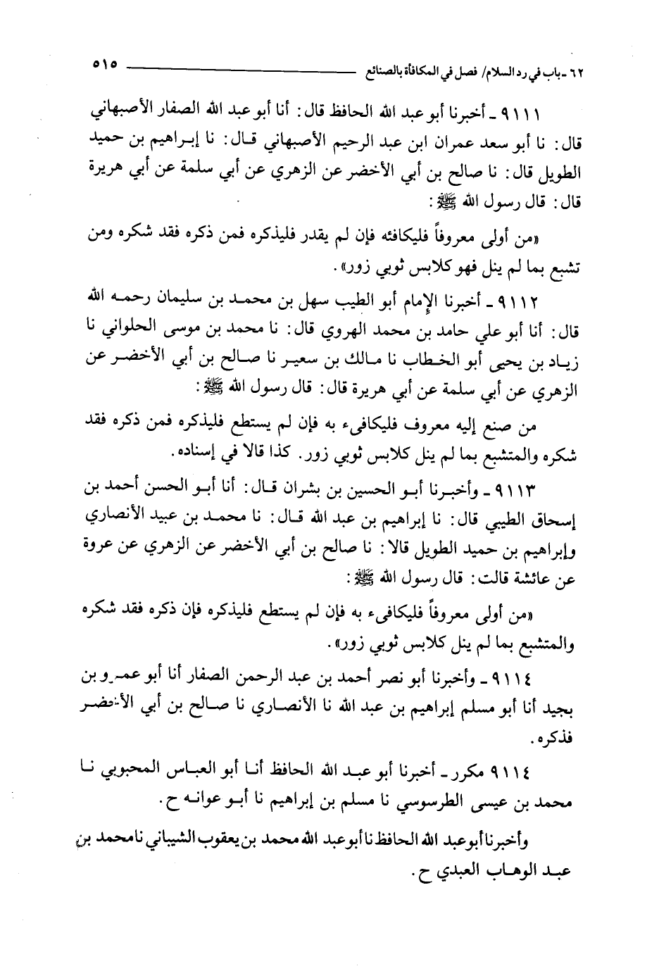 9114 - و أخبرنا أبو نصر أحمد بن عبد الرحمن الصفار أنا أبو عمرو بن بجيد أنا أبو مسلم إبراهيم بن عبد الله نا الأنصاري نا صالح بن أبي الأخضر : فذكره