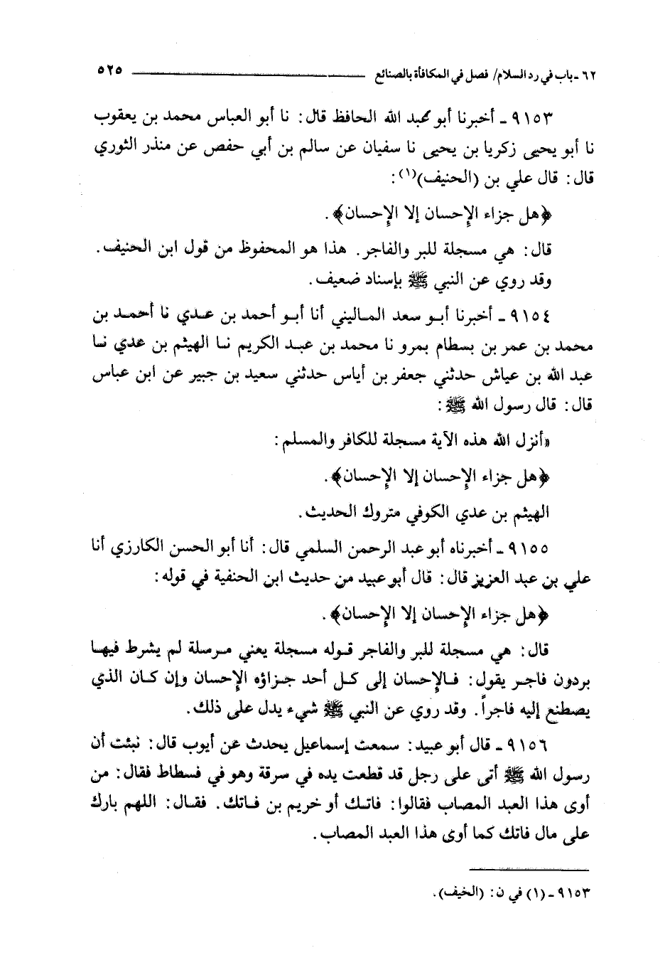 9153 - أخبرنا أبو عبد الله الحافظ قال : نا أبو العباس محمد بن يعقوب نا أبو يحيى زكريا بن يحيى نا سفيان عن سالم بن أبي حفص عن منذر الثوري قال : قال علي بن الحنيف : ـ { هل جزاء الإحسان إلا الإحسان }
