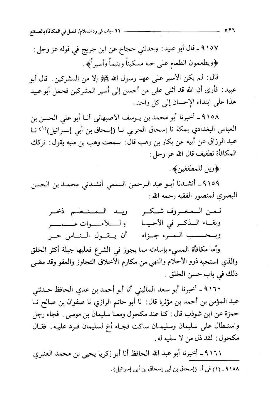 9158 - أخبرنا أبو محمد بن يوسف الأصبهاني أنا أبو علي الحسن بن العباس البغدادي بمكة نا إسحاق الحربي نا إسحاق بن أبي إسرائيل نا عبد الرزاق عن أبيه عن بكار بن وهب قال : سمعت وهب بن منبه يقول : تركك المكافأة تطفيف قال الله عز و جل :