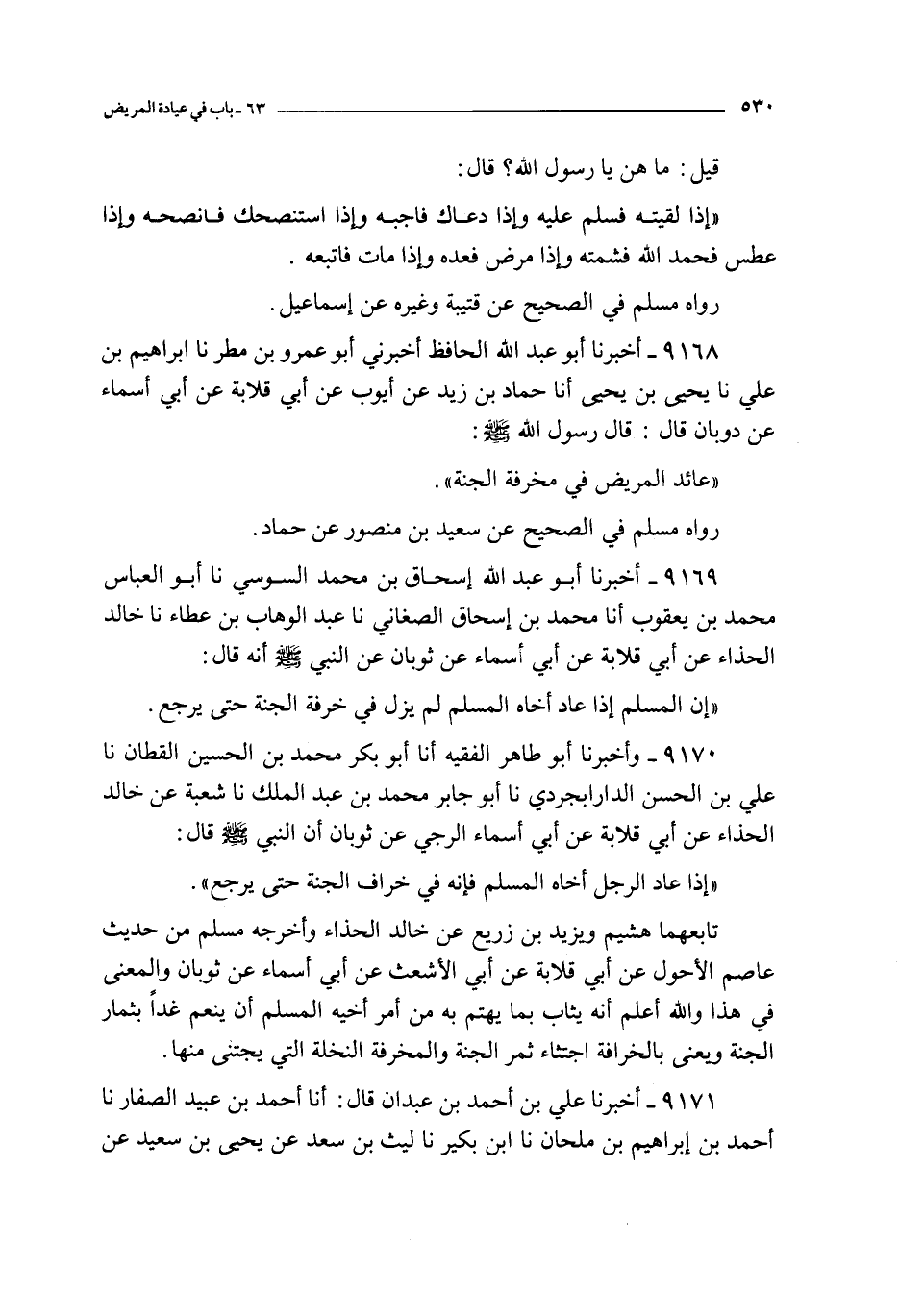9170 - و أخبرنا أبو طاهر الفقيه أنا أبو بكر محمد بن الحسين القطان نا علي بن الحسن الدارابجردي نا أبو جابر محمد بن عبد الملك نا شعبة عن خالد الحذاء عن أبي قلابة عن أبي أسماء الرجي عن ثوبان : أن النبي صلى الله عليه و سلم قال :