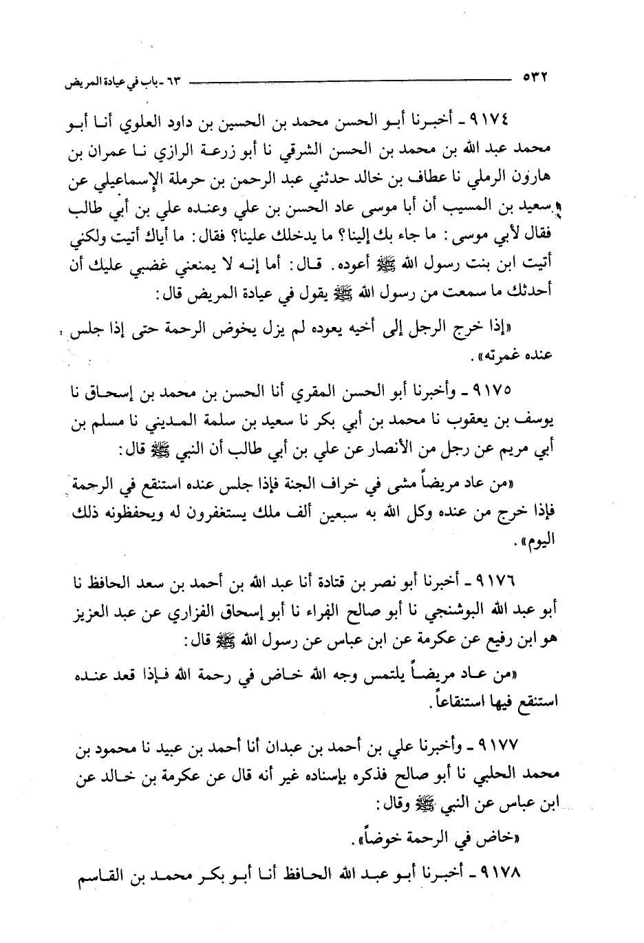 9174 - أخبرنا أبو الحسن محمد بن الحسين بن داود العلوي أنا أبو محمد عبد الله بن محمد بن الحسن الشرقي نا أبو زرعة الرازي نا عمران بن هارون الرملي نا عطاف بن خالد حدثني عبد الرحمن بن حرملة الإسماعيلي عن سعيد بن المسيب : أن أبا موسى عاد الحسن بن علي و عنده علي بن أبي طالب فقال لأبي موسى : ما جاء بك إلينا ؟ ما يدخلك علينا ؟ فقال : ما أياك أتيت و لكني أتيت ابن بنت رسول الله صلى الله عليه و سلم أعوده قال : أما إنه لا يمنعني غضبي عليك أن أحدثك ما سمعت من رسول الله صلى الله عليه و سلم يقول في عيادة المريض