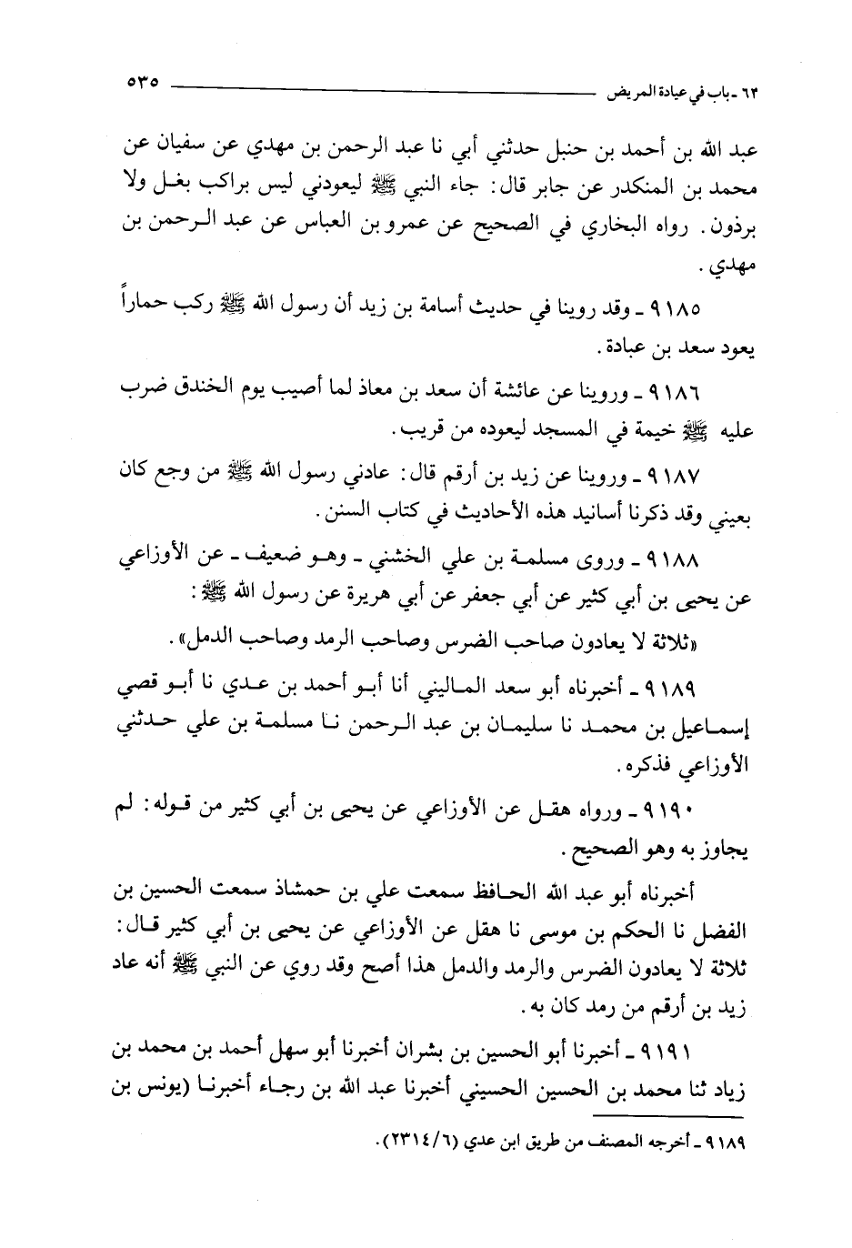 9187 - و روينا عن زيد بن أرقم قال : عادني رسول الله صلى الله عليه و سلم من وجع كان بعيني و قد ذكرنا أسانيد هذه الأحاديث في كتاب السنن