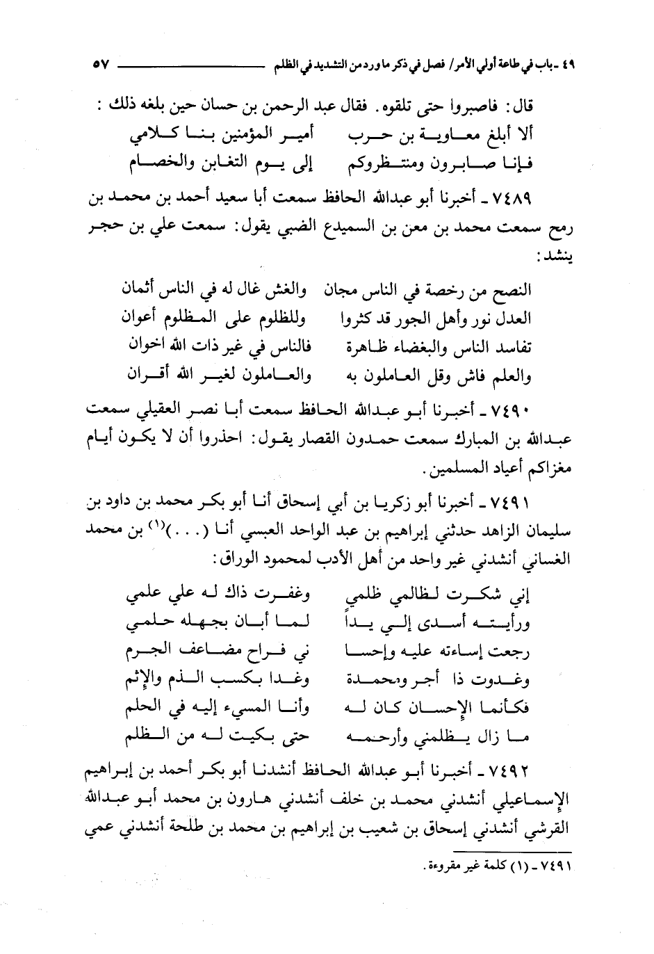 7492 - أخبرنا أبو عبد الله الحافظ أنشدنا أبو بكر أحمد بن إبراهيم الإسماعيلي أنشدني محمد بن خلف أنشدني هارون بن محمد أبو عبد الله القرشي أنشدني إسحاق بن شعيب بن إبراهيم بن محمد بن طلحة أنشدني عمي يونس بن إبراهيم لمحمد بن عيسى بن طلحة بن عبد الله : ـ ( فلا تعجل على أحد يظلم فإن الظلم مرتعه وخيم )