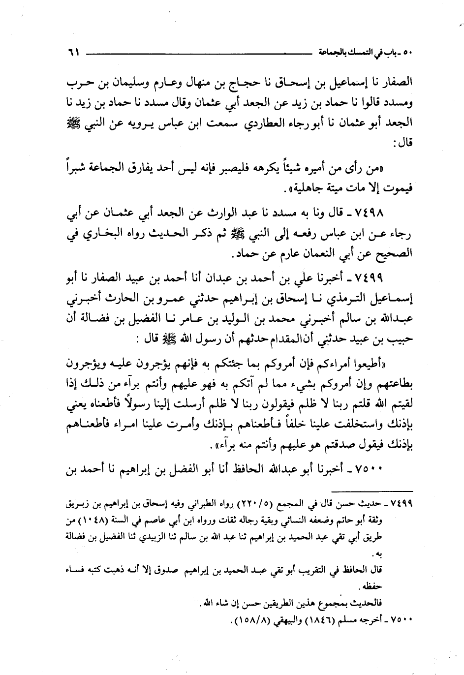 7498 - قال و نا به مسدد نا عبد الوارث عن الجعد أبي عثمان عن أبي رجاء عن ابن عباس : رفعه إلى النبي صلى الله عليه و سلم ثم ذكر الحديث رواه البخاري في الصحيح عن أبي النعمان عارم عن حماد