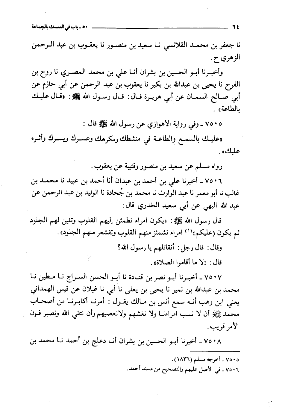 7507 - أخبرنا أبو نصر بن قتادة نا أبو الحسن السراج نا مطين نا محمد بن عبد الله بن نمير نا يحيى بن يعلى نا أبي يعلى نا أبي نا غيلان عن قيس الهمداني يعني ابن وهب أنه سمع أنس بن مالك يقول : أمرنا أكابرنا من أصحاب محمد صلى الله عليه و سلم أن لا نسب امراءنا و لا نغشهم و لا نعصيهم و أن نتقي الله و نصبر فإن الأمر قريب