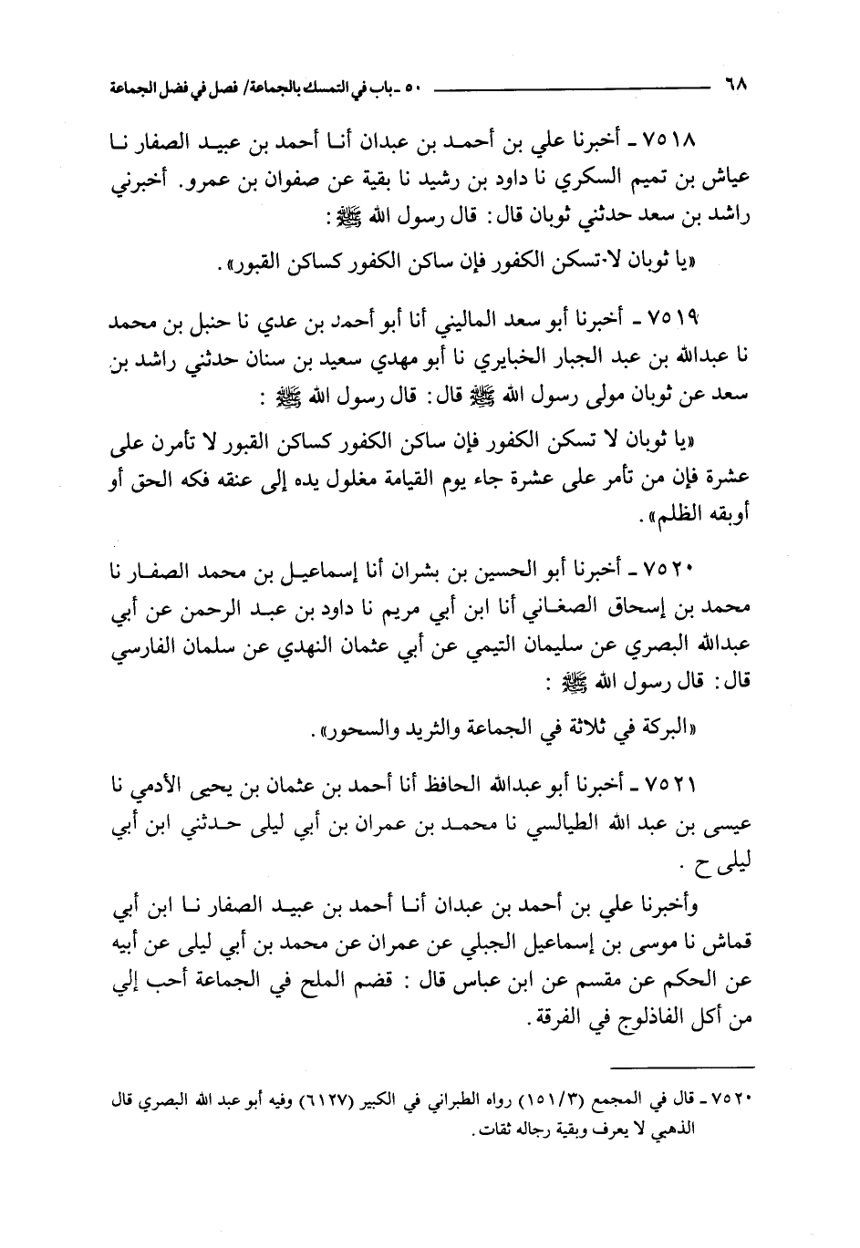 7518 - أخبرنا علي بن أحمد بن عبدان أنا أحمد بن عبيد الصفار نا عياش بن تميم السكري نا داود بن رشيد نا بقية عن صفوان بن عمرو أخبرني راشد بن سعد حدثني ثوبان قال : قال رسول الله صلى الله عليه و سلم :