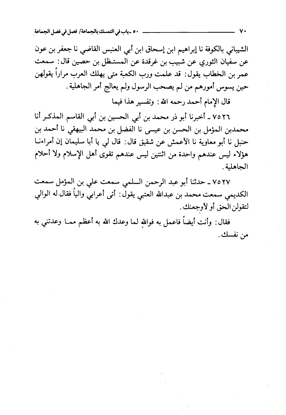 7526 - أخبرنا أبو ذر محمد بن أبي الحسين بن أبي القاسم المذكر أنا محمد بن المؤمل بن الحسن بن عيسى نا الفضل بن محمد البيهقي نا أحمد بن حنبل نا أبو معاوية نا الأعمش عن شقيق قال : قال لي أبا سليمان إن أمراءنا هؤلاء ليس عندهم واحدة من اثنتين ليس عندهم تقوى أهل الإسلام و لا أحلام الجاهلية