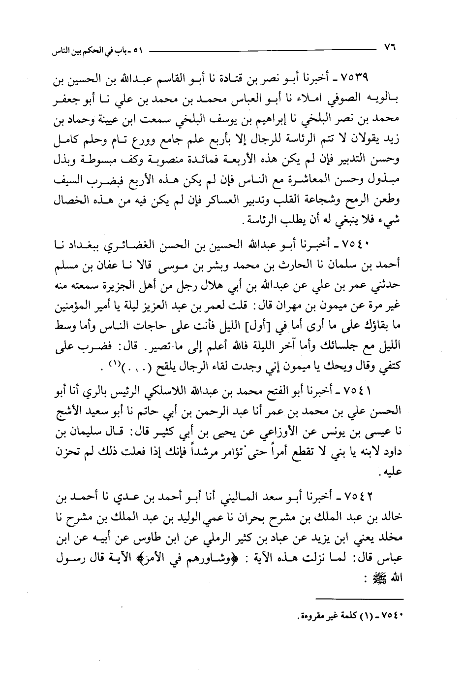 7539 - أخبرنا أبو نصر بن قتادة نا أبو القاسم عبد الله بن الحسين بن بالويه الصوفي املاء نا أبو العباس محمد بن محمد بن علي نا أبو جعفر محمد بن نصر البلخي نا إبراهيم بن يوسف البلخي سمعت ابن عيينة و حماد بن زيد يقولان : لا تتم الرئاسة للرجال إلا بأربع علم جامع و ورع تام و حلم كامل و حسن التدبير فإن لم يكن هذه الأربعة فمائدة منصوبة و كف مبسوطة و بذل مبذول و حسن المعاشرة مع الناس فإن لم يكن هذه الأربع فبضرب السيف و طعن الرمح و شجاعة القلب و تدبير العساكر فإن لم يكن فيه من هذه الخصال شيء فلا ينبغي له أن يطب الرئاسة