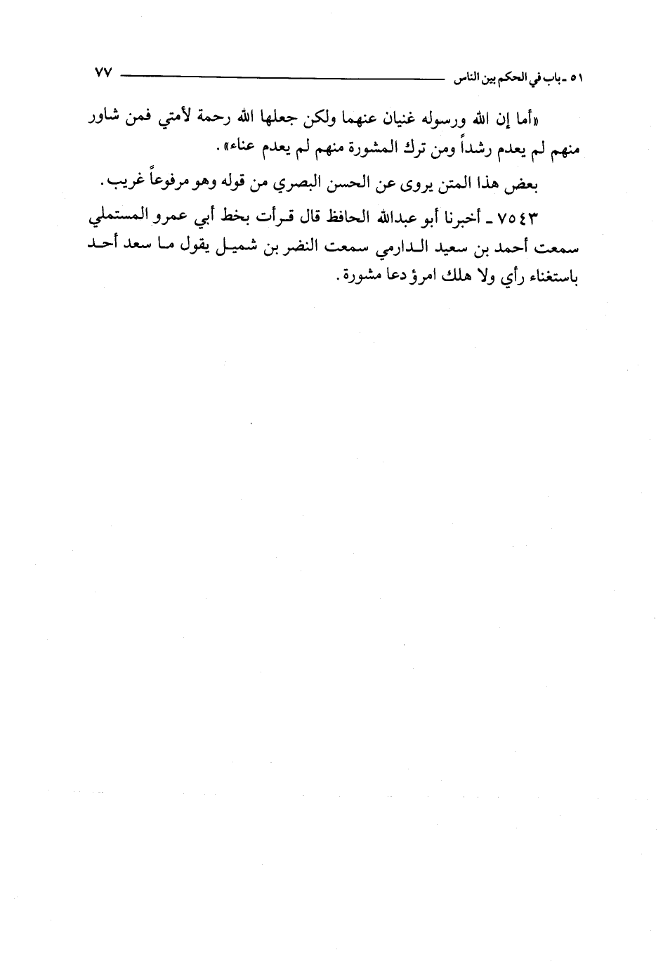 7543 - أخبرنا أبو عبد الله الحافظ قال قرأت بخط أبي عمرو المستملي سمعت أحمد بن سعيد الدرامي سمعت النضر بن شميل يقول : ما سعد أحد باستغناء رأي و لا هلك امرؤ دعا مشورة