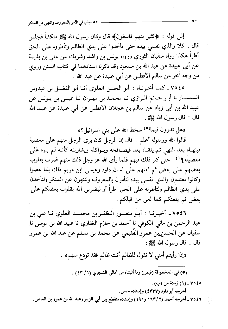 قالوا الله و رسوله أعلم قال إن الرجل كان يرى الرجل منهم على معصية فينهاه بعد النهي ثم يلقاه بعد فيصافحه و يواكله و يشاربه كأنه لم يره على معصيته حتى كثر ذلك فيهم فلما رأى الله عز و جل ذلك منهم ضرب بقلوب بعضهم على بعض ثم لعنهم على لسان داود و عيسى ابن مريم ذلك بما عصوا و كانوا يعتدون و الذي نفسي بيده لتأمرن بالمعروف ولتنهون عن المنكر و لتأخذن على يدي الظالم و لتأطرنه على الحق اطرأ أو ليضربن الله بقلوب بعضكم على بعض ثم يلعنكم كما لعن من قلبكم