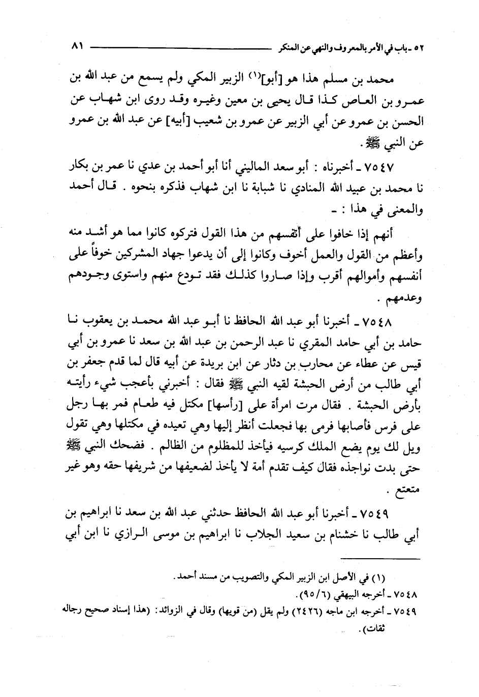 7547 - أخبرناه أبو سعيد الماليني أنا أبو أحمد بن عدي نا عمر بن بكار نا محمد بن عبيد الله المنادي نا شبابة نا ابن شهاب : فذكره بنحوه قال أحمد و المعنى في هذا :