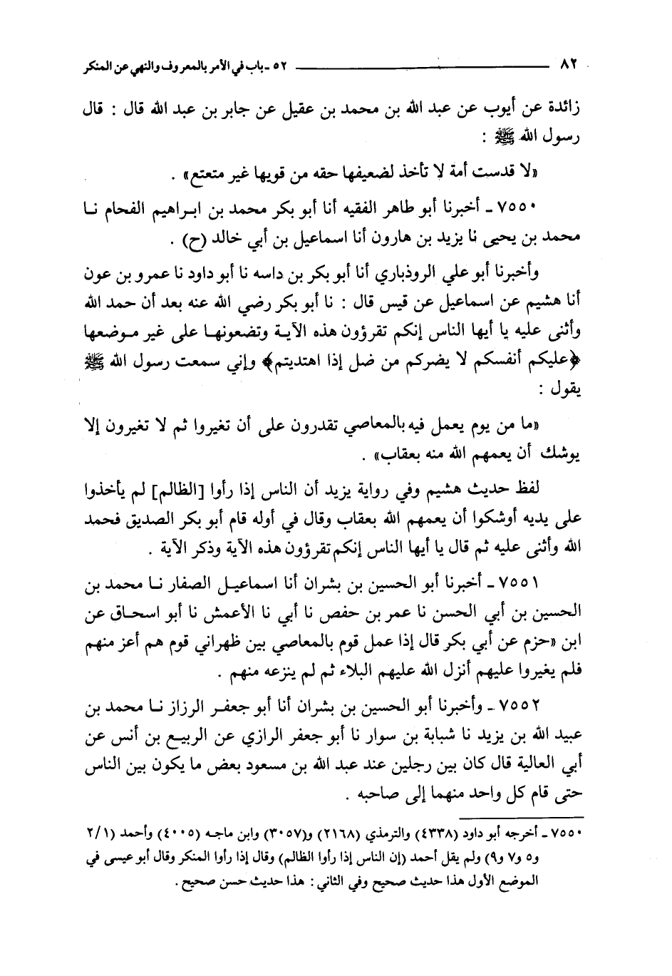 7551 - أخبرنا أبو الحسين بن بشران أنا إسماعيل الصفار نا محمد بن الحسين بن أبي الحسن نا عمر بن حفص نا أبي نا الأعمش نا أبو إسحاق عن ابن حزم عن أبي بكر قال : إذا عمل قوم بالمعاصي بين ظهراني قوم هم أعز منهم فلم يغيروا عليهم أنزل الله عليهم البلاء ثم لم ينزعه منهم