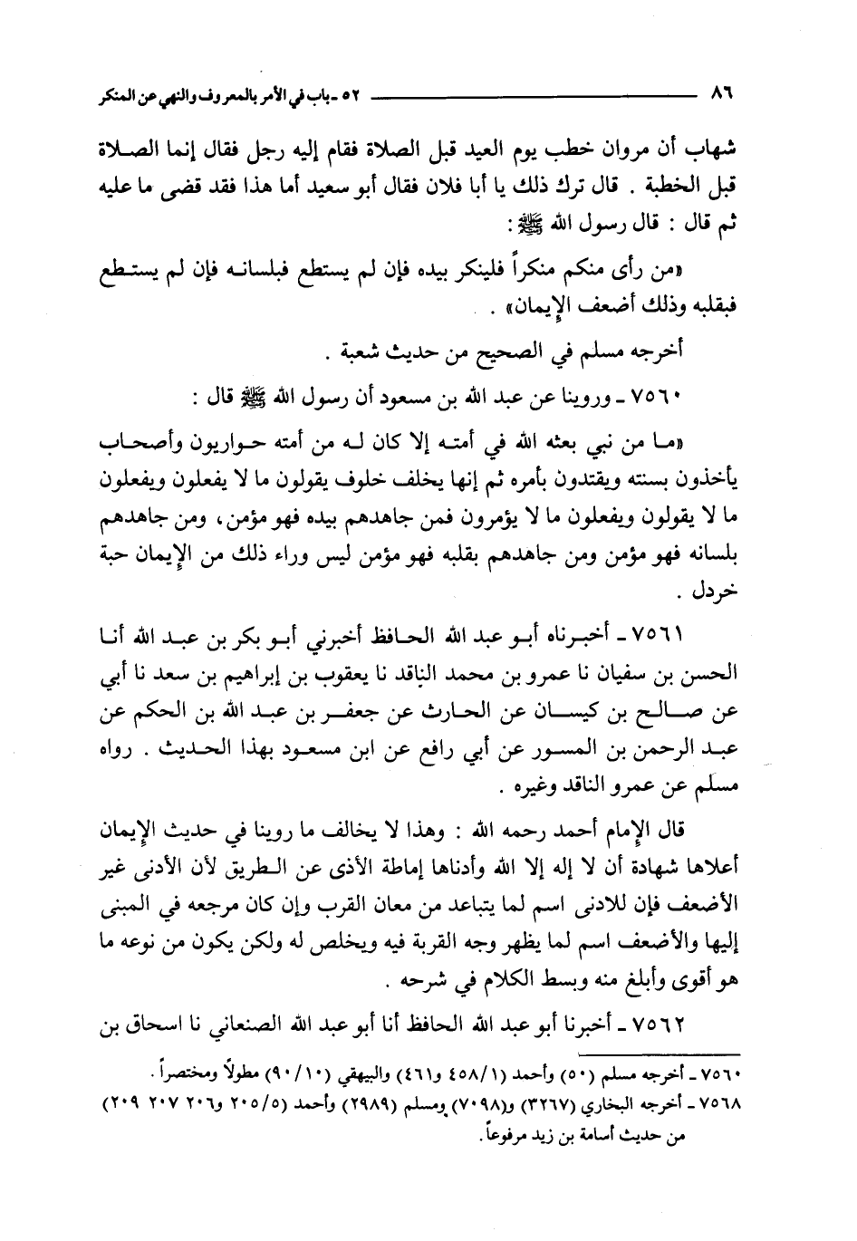7561 - أخبرناه أبو عبد الله الحافظ أخبرني أبو بكر بن عبد الله أنا الحسن بن سفيان نا عمرو بن محمد الناقد نا يعقوب بن إبراهيم بن سعد نا أبي عن صالح بن كيسان عن الحارث عن جعفر بن عبد الله بن الحكم عن عبد الرحمن بن المسور عن أبي رافع عن ابن مسعود بهذا الحديث رواه مسلم عن عمرو الناقد و غيره : قال الإمام أحمد رحمه الله : و هذا لا يخالف ما روينا في حديث الإيمان أعلاها شهادة أن لا إله إلا الله و أدناها إماطة الأذى عن الطريق لأن الأدنى غير الأضعف فإن للأدنى اسم لم يتباعد من معان القرب و إن كان مرجعه في المبنى إليها و الأضعف اسم لما يظهر وجه القربة فيه و يخلص له و لكن يكون من نوعه ما هو أقوى و أبلغ منه و بسط الكلام في شرحه