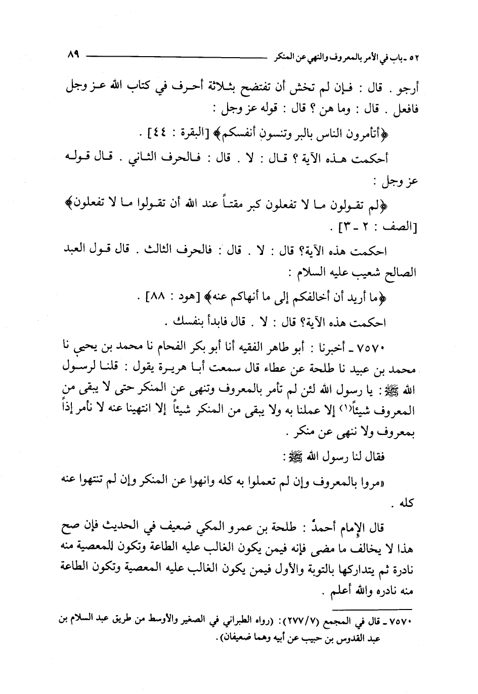 7570 - أخبرنا أبو طاهر الفقيه أنا أبو بكر الفحام نا محمد بن يحيى نا محمد بن عبيد نا طلحة عن عطاء قال سمعت أبا هريرة يقول : قلنا لرسول صلى الله عليه و سلم : يا رسول الله لئن لم تأمر بالمعروف و تنهى عن المنكر حتى لا يبقى من المعروف شيئا إلا علمنا به و لا يبقى من المنكر شيئا إلا انتهينا عنه لا نأمر إذا بمعروف و لا ننهى عن منكر