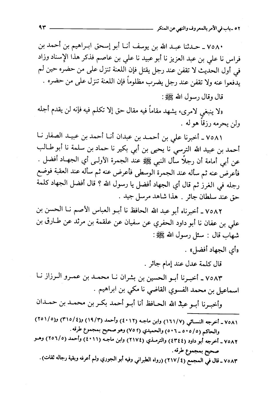 7581 - أخبرنا علي بن أحمد بن عبدان أنا أحمد بن عبيد الصفار نا أحمد بن عبيد الله الترسي نا يحيى بن أبي بكير نا حماد بن سلمة نا أبو طالب عن أبي أمامة : أن رجلا سأل النبي صلى الله عليه و سلم عند الجمرة الأولى أي الجهاد أفضل فأعرض عنه ثم سأله عند الجمرة الوسطى فأعرض عنه ثم سأله عند العقبة فوضع رجله في الغرز ثم قال أي الجهاد أفضل يا رسول الله ؟ قال أفضل الجهاد كلمة حق عند سلطان جائر