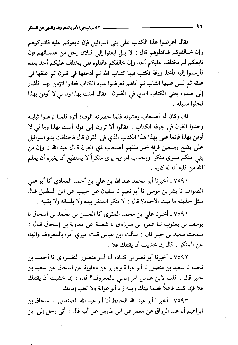 7593 - أخبرنا أبو عبد الله الحافظ أنا أبو عبد الله الصنعاني نا إسحاق بن إبراهيم أنا عبد الرزاق عن معمر عن ابن طاوس عن أبيه قال : أتى رجل إلى ابن عباس قال ألا أقوم إلى هذا السلطان فآمره و أنهاه ؟ قال : لا تكن لك فتنة