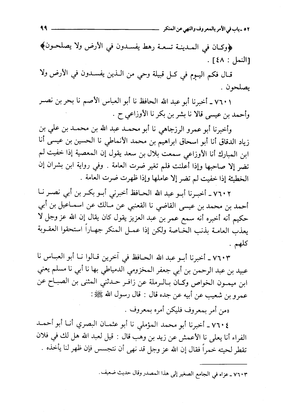7602 - أخبرنا أبو عبد الله الحافظ أخبرني أبو بكر بن أبي نصر نا أحمد بن محمد بن عيسى القاضي نا القنبعي عن مالك عن إسماعيل بن أبي حكيم : أنه أخبره أنه سمع عمر بن عبد العزيز يقول كان يقال إن الله عز و جل لا يعذب العامة بذنب الخاصة و لكن إذا عمل المنكر جهارا استحقوا العقوبة كلهم