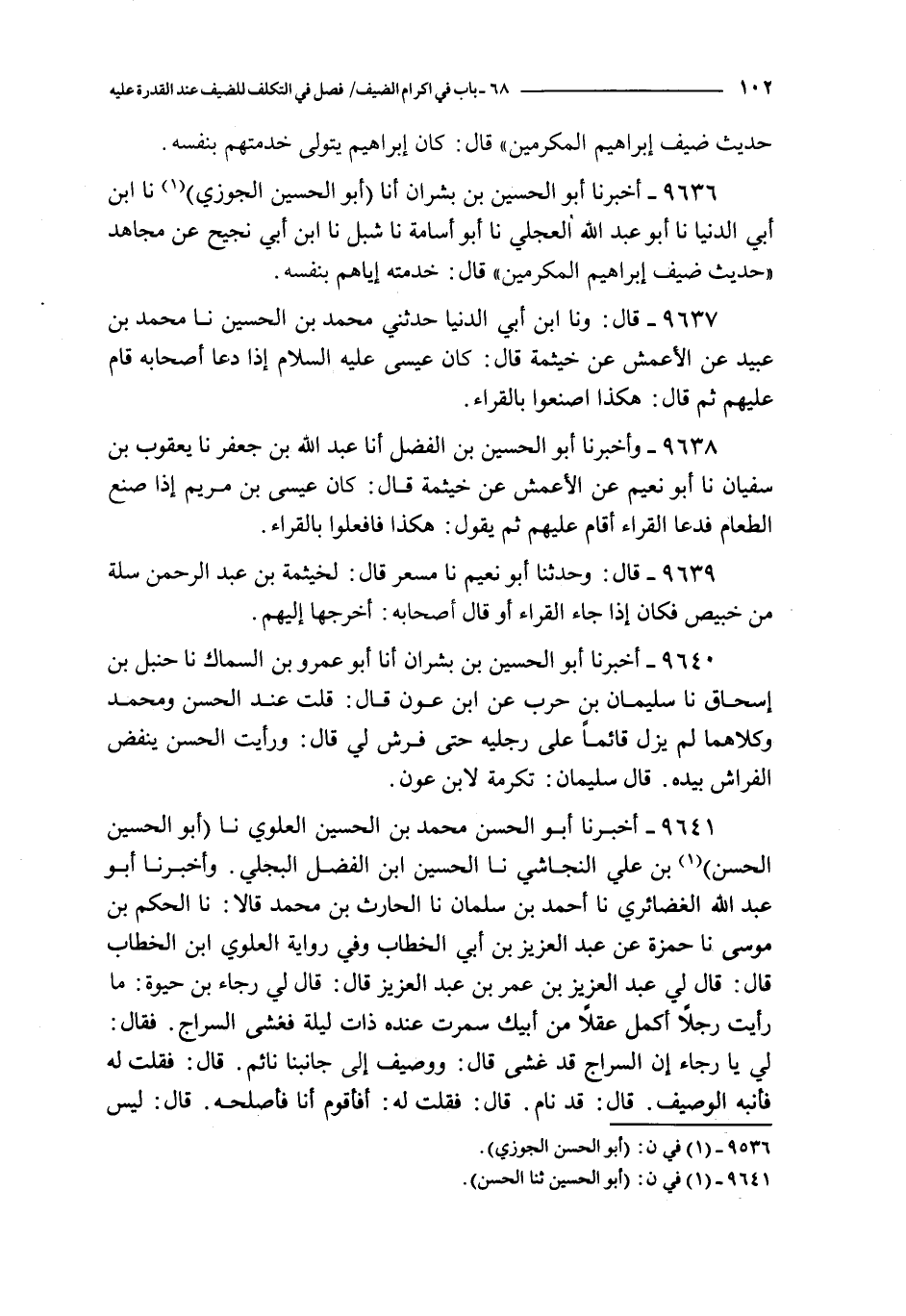 9636 - أخبرنا أبو الحسين بن بشران أنا أبو الحسين الجوزي نا ابن أبي الدنيا نا أبو عبد الله العجلي نا أبو أسامة نا شبل نا ابن أبي نجيح عن مجاهد : حديث ضيف إبراهيم المكرمين قال : خدمته إياهم بنفسه
