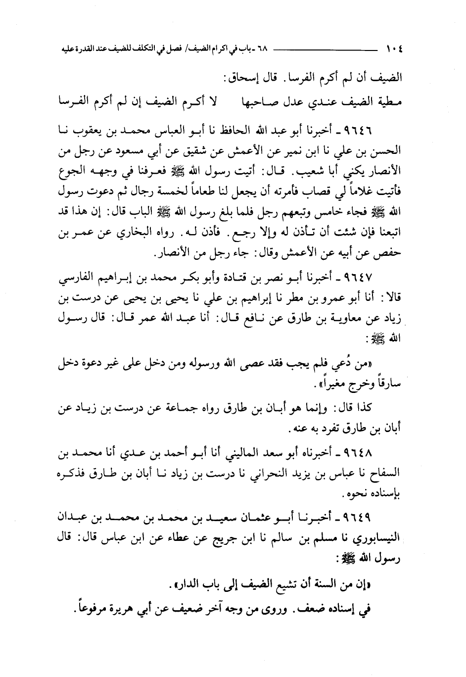 9649 - أخبرنا أبو عثمان سعيد بن محمد بن محمد بن عبدان النيسابوري نا مسلم بن سالم نا ابن جريج عن عطاء عن ابن عباس قال : قال رسول الله صلى الله عليه و سلم : إن من السنة أن تشيع الضيف إلى باب الدار