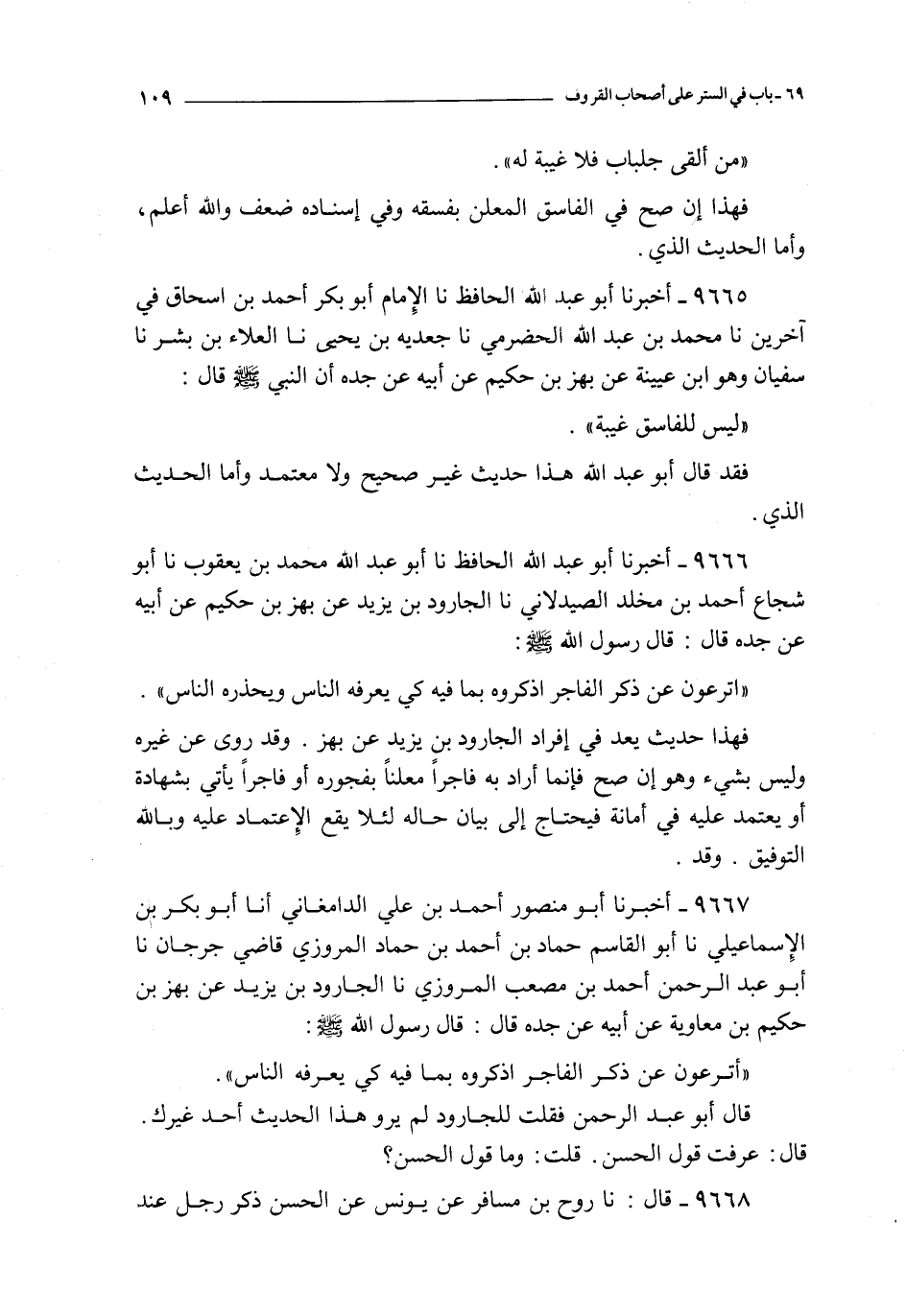 9666 - أخبرنا أبو عبد الله الحافظ نا أبو عبد الله محمد بن يعقوب نا أبو شجاع أحمد بن مخلد الصيدلاني نا الجارود بن يزيد عن بهز بن حكيم عن أبيه عن جده قال : قال رسول الله صلى الله عليه و سلم : أترعون عن ذكر الفاجر اذكروه بما فيه كي يعرفه الناس و يحذره الناس فهذا حديث يعد في إفراد الجارود بن يزيد عن بهز و قد روى عن غيره و ليس بشيء و هو إن صح فإنما أراد به فاجرا معلنا بفجوره أو فاجرا يأتي بشهادة أو يعتمد عليه في أمانة فيحتاج إلى بيان حاله لئلا يقع الإعتماد عليه و بالله التوفيق و قد