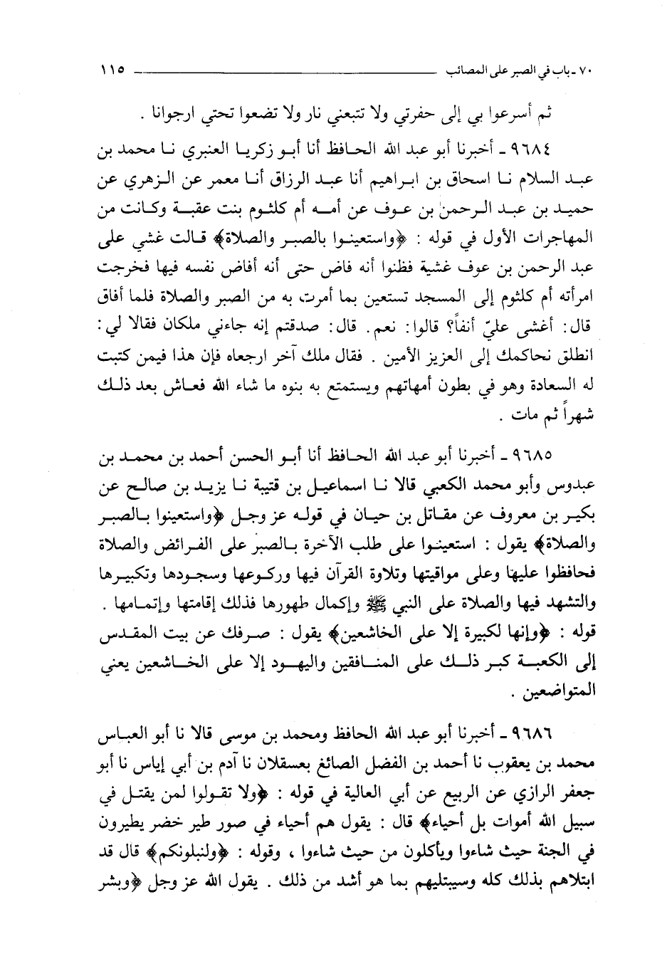 9684 - أخبرنا أبو عبد الله الحافظ أنا أبو زكريا العنبري نا محمد بن عبد السلام نا إسحاق بن إبراهيم أنا عبد الرزاق أنا معمر عن الزهري عن حميد بن عبد الرحمن بن عوف : عن أمه أم كلثوم بنت عقبة و كانت من المهاجرات الأول في قوله : { و استعينوا بالصبر و الصلاة } قالت غشي على عبد الرحمن بن عوف غشية فظنوا أنه فاض حتى أنه أفاض نفسه فيها فخرجت امرأته أم كلثوم إلى المسجد تستعين بما أمرت به من الصبر و الصلاة فلما أفاق قال : أغشى علي أنفا ؟ قالوا : نعم قال : صدقتم إنه جاءني ملكان فقالا لي : انطلق نحاكمك إلى العزيز الأمين فقال ملك آخر ارجعاه فإن هذا فيمن كتبت له السعادة و هو في بطون أمهاتهم و يستمتع به بنوه ما شاء الله فعاش بعد ذلك شهرا ثم مات