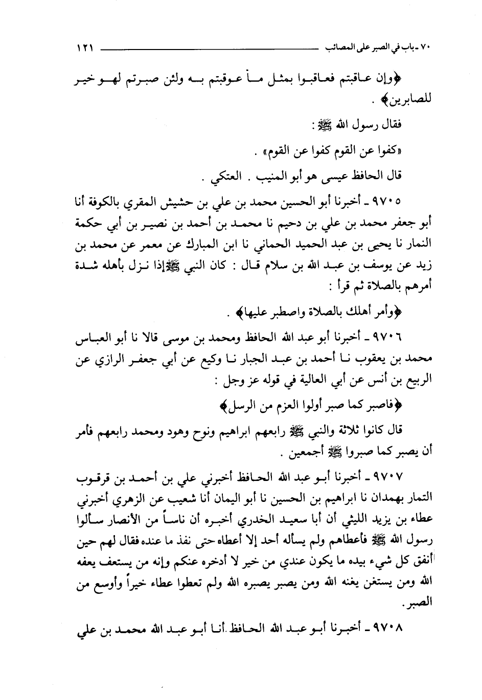 9705 - أخبرنا أبو الحسين محمد بن علي بن حشيش المقري بالكوفة أنا أبو جعفر محمد بن علي بن دحيم نا محمد بن أحمد بن نصير بن أبي حكمة النمار نا يحيى بن عبد الحميد الحماني نا ابن المبارك عن معمر عن محمد بن زيد عن يوسف بن عبد الله بن سلام قال : كان النبي صلى الله عليه و سلم إذا نزل بأهله شدة أمرهم بالصلاة ثم قرأ : { و أمر أهلك بالصلاة و اصطبر عليها }