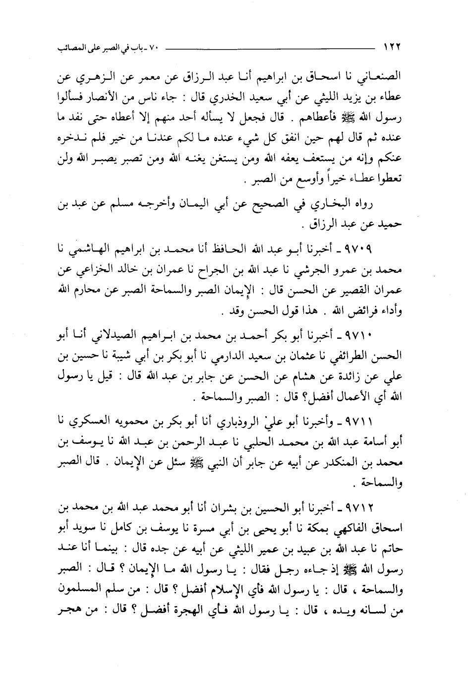 9711 - و أخبرنا أبو علي الروذباري أنا أبو بكر بن محمويه العسكري نا أبو أسامة عبد الله بن محمد الحلبي نا عبد الرحمن بن عبد الله نا يوسف بن محمد بن المنكدر عن أبيه عن جابر : أن النبي صلى الله عليه و سلم سئل عن الإيمان قال الصبر و السماحة