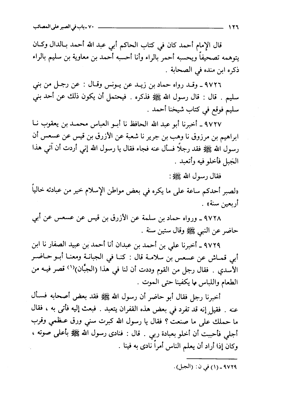 9727 - أخبرنا أبو عبد الله الحافظ نا أبو العباس محمد بن يعقوب نا إبراهيم بن مرزوق نا وهب بن جرير نا شعبة عن الأزرق بن قيس عن عسعس : أن رسول الله صلى الله عليه و سلم فقد رجلا فسأل عنه فجاء فقال يا رسول الله إني أردت أن آتي هذا الجبل فأخلو فيه و أتعبد