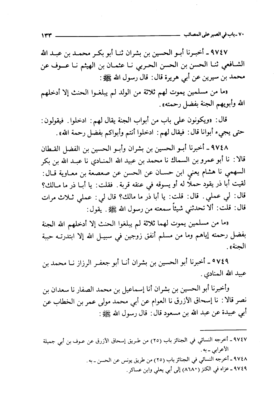 9747 - أخبرنا أبو الحسين بن بشران ثنا أبو بكر محمد بن عبد الله الشافعي ثنا الحسن بن الحسن الحربي نا عثمان بن الهيثم نا عوف عن محمد بن سيرين عن أبي هريرة قال : قال رسول الله صلى الله عليه و سلم : ما من مسلمين يموت لهم ثلاثة من الولد لم يبلغوا الحنث إلا أدخلهم الله و أبويهم الجنة بفضل رحمته