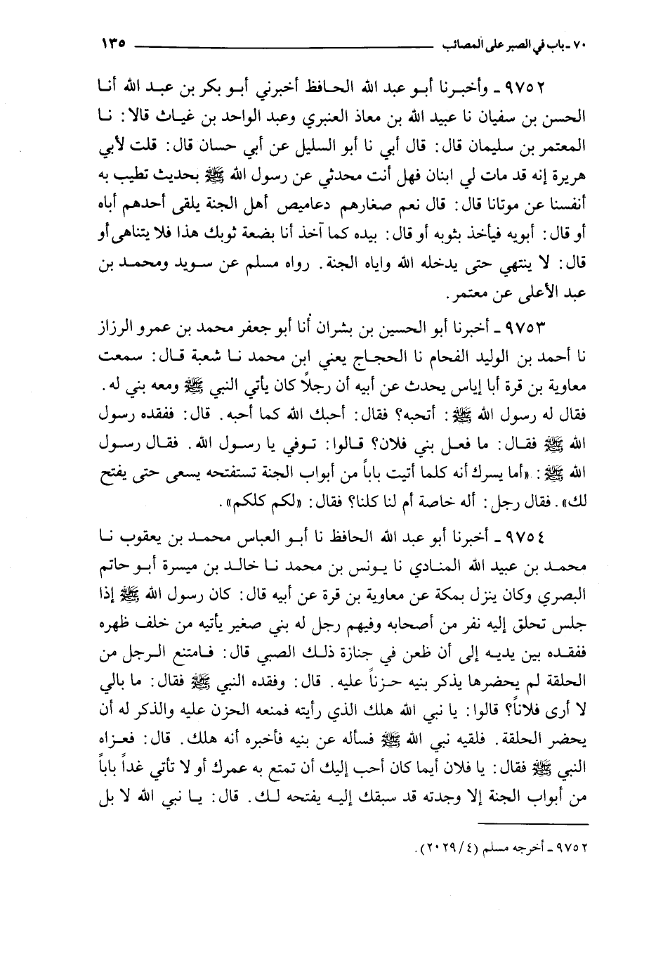 9754 - أخبرنا أبو عبد الله الحافظ نا أبو العباس محمد بن يعقوب نا محمد بن عبيد الله المنادي نا يونس بن محمد نا خالد بن ميسرة أبو حاتم البصري و كان ينزل بمكة عن معاوية بن قرة عن أبيه قال : كان رسول الله صلى الله عليه و سلم إذا جلس تحلق إليه نفر من أصحابه و فيهم رجل له بني صغير يأتيه من خلف ظهره ففقده بين يديه إلى أن ظعن في جنازة ذلك الصبي قال : فامتنع الرجل من الحلقة لم يحضرها يذكر بنيه حزنا عليه قال : و فقده النبي صلى الله عليه و سلم فقال : ما بالي لا أرى فلانا ؟ قالوا : يا نبي الله هلك الذي رأيته فمنعه الحزن عليه و الذكر له أن يحضر الحلقة فلقيه نبي الله صلى الله عليه و سلم فسأله عن بنيه فأخبره أنه هلك قال : فعزاه النبي صلى الله عليه و سلم فقال : يا فلان أيما كان أحب إليك أن تمتع به عمرك أو لا تأتي غدا بابا من أبواب الجنة إلا وجدته قد سبقك إليه يفتحه لك قال : يا نبي الله لا بل يسبقني إلى أبواب الجنة أحب إلي قال : فذاك لك فقام رجل من الأنصار فقال : يا نبي الله أهذا لهذا خاصة أم من هلك له طفل من المسلمين كان ذاك له قال : بل من هلك له طفل من المسلمين كان ذلك له