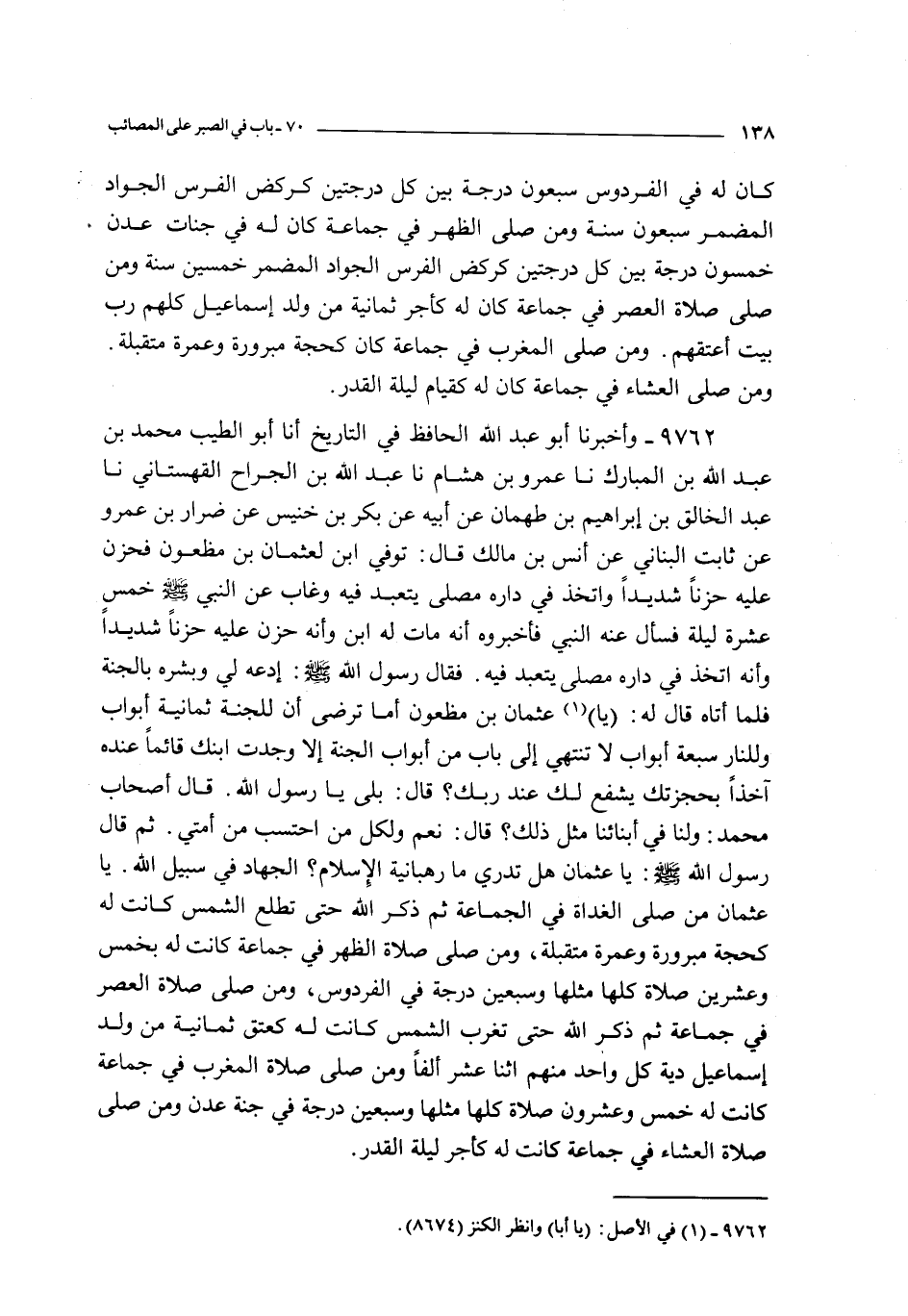 9762 - و أخبرنا أبو عبد الله الحافظ في التاريخ أنا أبو الطيب محمد بن عبد الله بن المبارك نا عمرو بن هشام نا عبد الله بن الجراح القهستاني نا عبد الخالق بن إبراهيم بن طهمان عن أبيه عن بكر بن خنيس عن ضرار بن عمرو عن ثابت البناني عن أنس بن مالك قال : توفي ابن لعثمان بن مظعون فحزن عليه حزنا شديدا و اتخذ في داره مصلى يتعبد فيه و غاب عن النبي صلى الله عليه و سلم خمس عشرة ليلة فسأل عنه النبي فأخبروه أنه مات له ابن و أنه حزن عليه حزنا شديدا و أنه اتخذ في داره مصلى يتعبد فيه فقال رسول الله صلى الله عليه و سلم : ادعه لي و بشره بالجنة فلما أتاه قال له : يا عثمان بن مظعون أما ترضى أن للجنة ثمانية أبواب و للنار سبعة أبواب لا تنتهي إلى باب من أبواب الجنة إلا وجدت ابنك قائما عنده آخذا بحجزتك يشفع لك عند ربك ؟ قال : بلى يا رسول الله قال أصحاب محمد : و لنا في أبنائنا مثل ذلك ؟ قال : نعم و لكل من احتسب من أمتي ثم قال رسول الله صلى الله عليه و سلم : يا عثمان هل تدري ما رهبانية الإسلام ؟ الجهاد في سبيل الله يا عثمان من صلى صلاة الغداة في الجماعة ثم ذكر الله حتى تطلع الشمس كانت له كحجة مبرورة و عمرة متقبلة و من صلى صلاة الظهر في جماعة كانت له بخمس و عشرين صلاة كلها مثلها و سبعين درجة في الفردوس و من صلى صلاة العصر في جماعة ثم ذكر الله حتى تغرب الشمس كانت له كعتق ثمانية من ولد إسماعيل دية كل واحد منهم اثنا عشر ألفا و من صلى صلاة المغرب في جماعة كانت له خمس و عشرون صلاة كلها مثلها و سبعين درجة في جنة عدن و من صلى صلاة العشاء في جماعة كانت له كأجر ليلة القدر