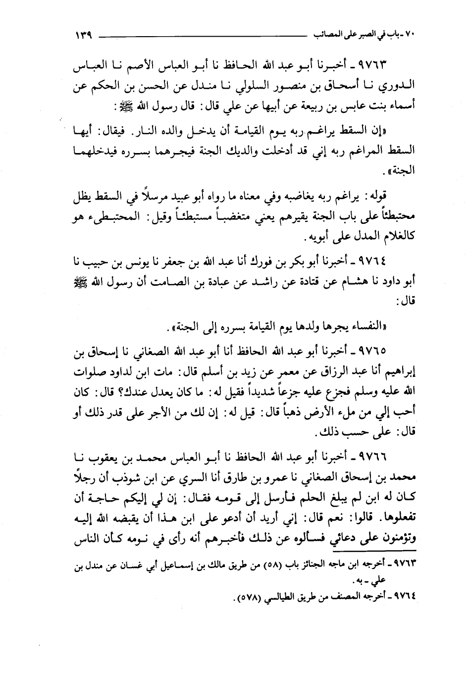 9764 - أخبرنا أبو بكر بن فورك أنا عبد الله بن جعفر نا يونس بن حبيب نا أبو داود نا هشام عن قتادة عن راشد عن عبادة بن الصامت : أن رسول الله صلى الله عليه و سلم قال : النفساء يجرها ولدها يوم القيامة بسرره إلى الجنة
