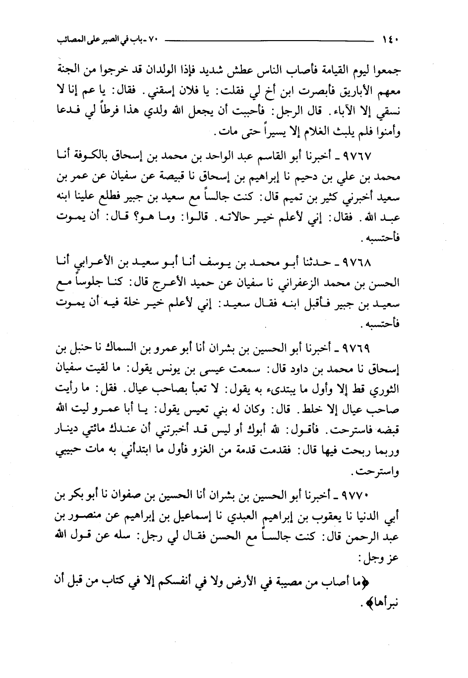 9767 - أخبرنا أبو القاسم عبد الواحد بن محمد بن إسحاق بالكوفة أنا محمد بن علي بن دحيم نا إبراهيم بن إسحاق نا قبيصة عن سفيان عن عمر بن سعيد أخبرني كثير بن تميم قال : كنت جالسا مع سعيد بن جبير فطلع علينا ابنه عبد الله فقال : إني لأعلم خير حالاته قالوا : و ما هو ؟ قال : أن يموت فأحتسبه