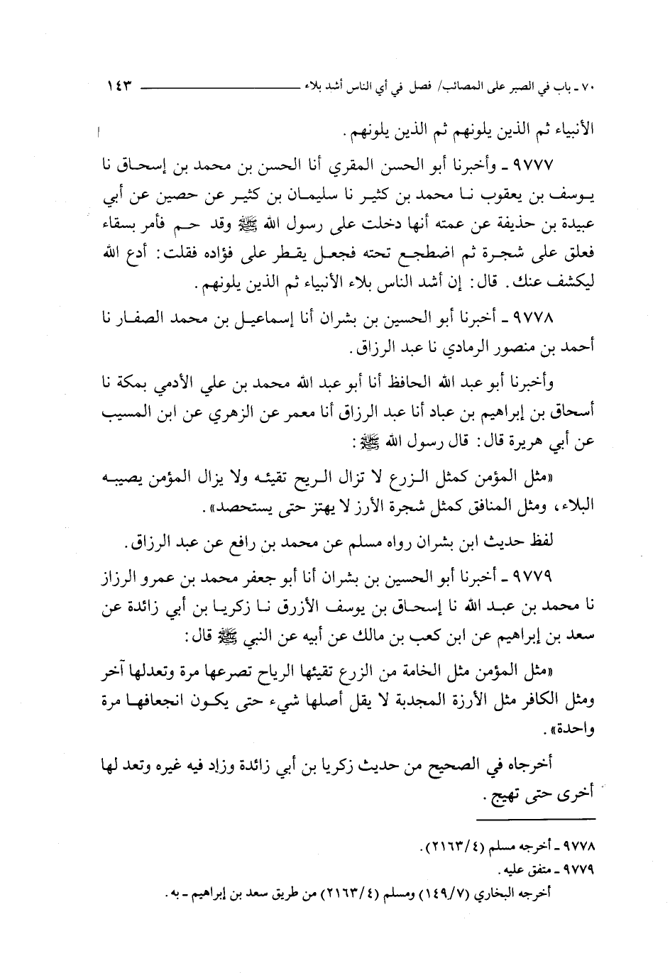 و أخبرنا أبو عبد الله الحافظ أنا أبو عبد الله محمد بن علي الأدمي بمكة نا إسحاق بن إبراهيم بن عباد أنا عبد الرزاق أنا معمر عن الزهري عن ابن المسيب عن أبي هريرة قال : قال رسول الله صلى الله عليه و سلم : مثل المؤمن كمثل الزرع لا تزال الريح تقيئه و لا يزال المؤمن يصيبه البلاء و مثل المنافق كمثل شجرة الأرز لا يهتز حتى يستحصد
