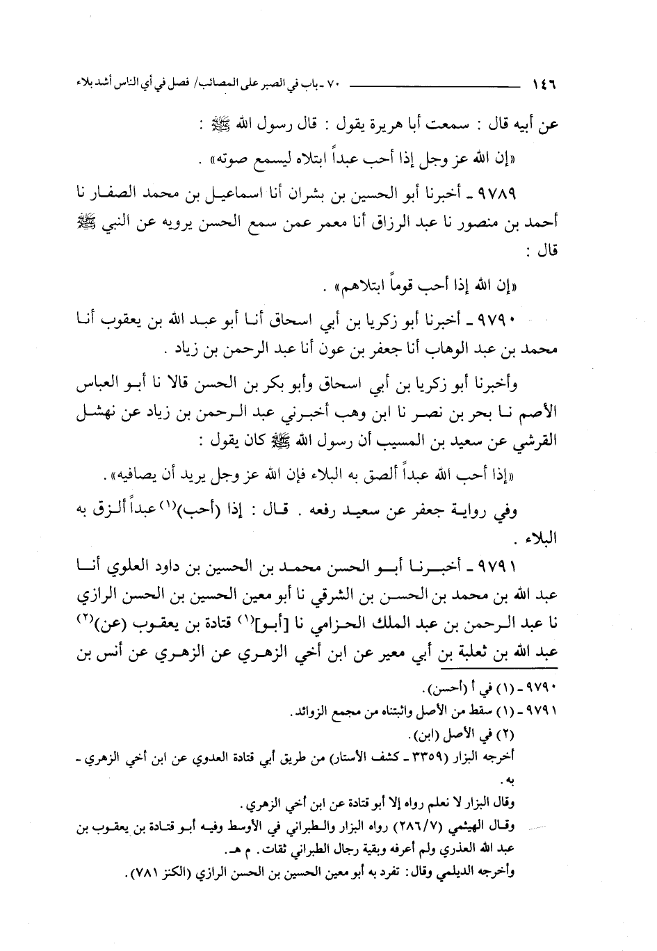 9789 - أخبرنا أبو الحسين بن بشران أنا إسماعيل بن محمد الصفار نا أحمد بن منصور نا عبد الرزاق أنا معمر عمن سمع الحسن يرويه : عن النبي صلى الله عليه و سلم قال : إن الله إذا أحب قوما ابتلاهم