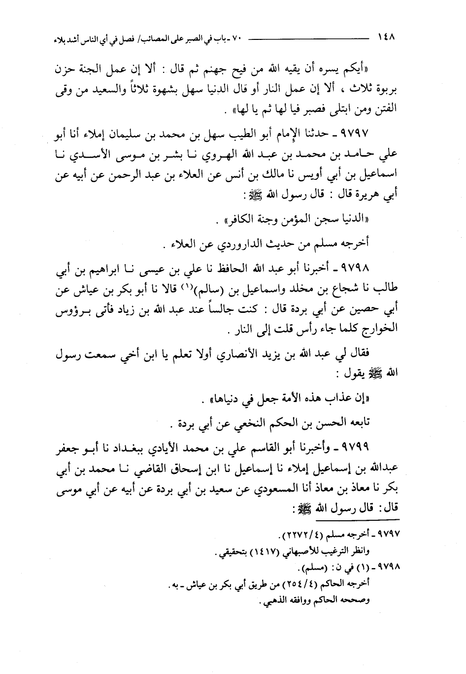 9798 - أخبرنا أبو عبد الله الحافظ نا علي بن عيسى نا إبراهيم بن أبي طالب نا شجاع بن مخلد و إسماعيل بن سالم قالا نا أبو بكر بن عياش عن أبي حصين عن أبي بردة قال : كنت جالسا عند عبد الله بن زياد فأتي برؤوس الخوارج كلما جاء رأس قلت إلى النار