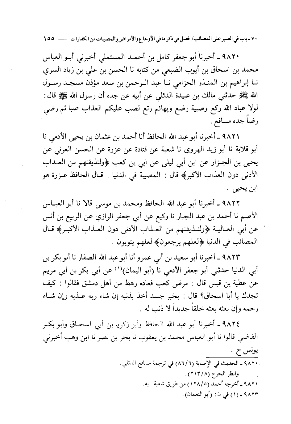 9821 - أخبرنا أبو عبد الله الحافظ أنا أحمد بن عثمان بن يحيى الأدمي نا أبو قلابة نا أبو زيد الهروي نا شعبة عن قتادة عن عزرة عن الحسن العرني عن يحيى بن الجزار عن ابن أبي ليلى : عن أبي بن كعب { و لنذيقنهم من العذاب الأدنى دون العذاب الأكبر } قال : المصيبة في الدنيا قال الحافظ عزرة هو ابن يحيى